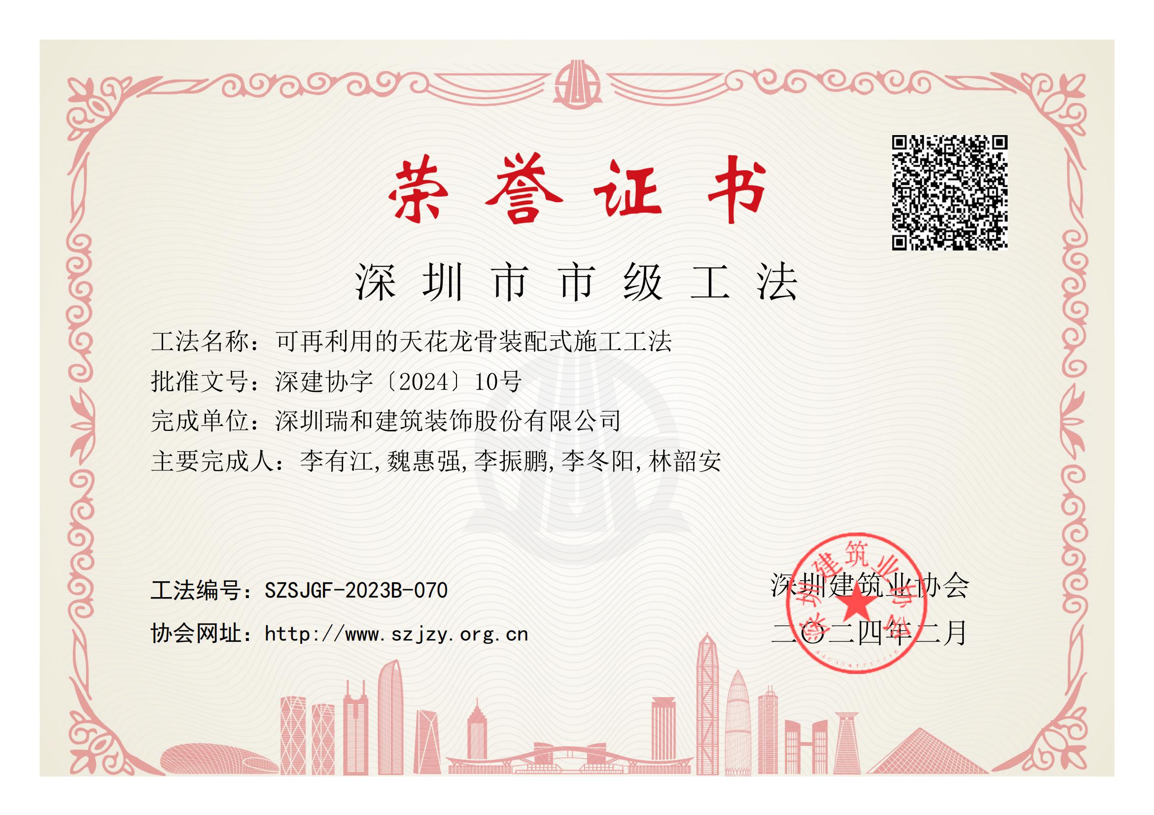 近日,由瑞和股份創新開發的“可再利用的天花龍骨裝配式施工工法”經行業專家評審,達到國內領先水平并獲得市級工法證書。該工法技術解決了傳統天花吊頂構造復雜、施工效率低、質量難于保證、材料循環利用率低等問題,滿足裝配式裝修技術和綠色施工要求,具有較好的經濟和社會效益,應用空間廣闊。