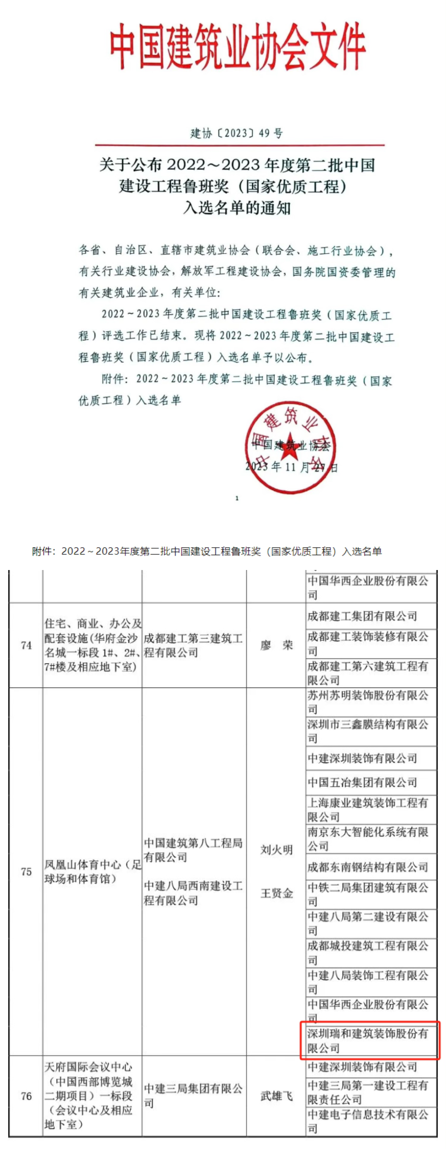 11月27日,中國建筑業(yè)協(xié)會公布了2022~2023年度第二批中國建設工程魯班獎(國家優(yōu)質工程)獲獎工程名單,深圳瑞和建筑裝飾股份有限公司(股票代碼:002620 股票簡稱:瑞和股份)參建的鳳凰山體育中心入選榜單,榮獲中國建設工程魯班獎。瑞和股份魯班“小金人”再+1!